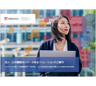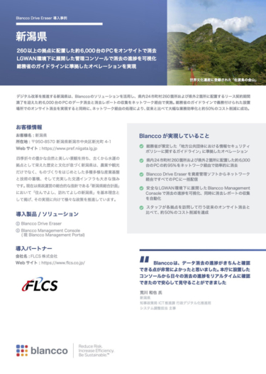 [セッション講演資料] データ消去の具体的対策 ~Blanccoデータ消去ソリューションのご紹介~ 統合自動データ消去ソリューションが セキュリティの最終防衛ラインを提供。 資料をダウンロード 法人・公共機関向けデータ消去ソリューションのご案内 Blanccoのソリューションの概要を紹介する冊子のPDFです。弊社の会社概要や実績・強みをはじめ、法人・公共機関向けの代表的なデータ消去ソリューションをご紹介しています。 資料をダウンロード 導入事例 – 新潟県 260以上の拠点に配置した約6,000台のPCをオンサイトで消去し、総務省のガイドラインに準拠 新潟県はBlanccoのソリューションを活用し、総務省のガイドラインで義務付けられたオンサイト消去と同時に、ネットワーク経由の処理により、従来と比べて大幅な業務効率化と約50%のコスト削減に成功。 資料をダウンロード